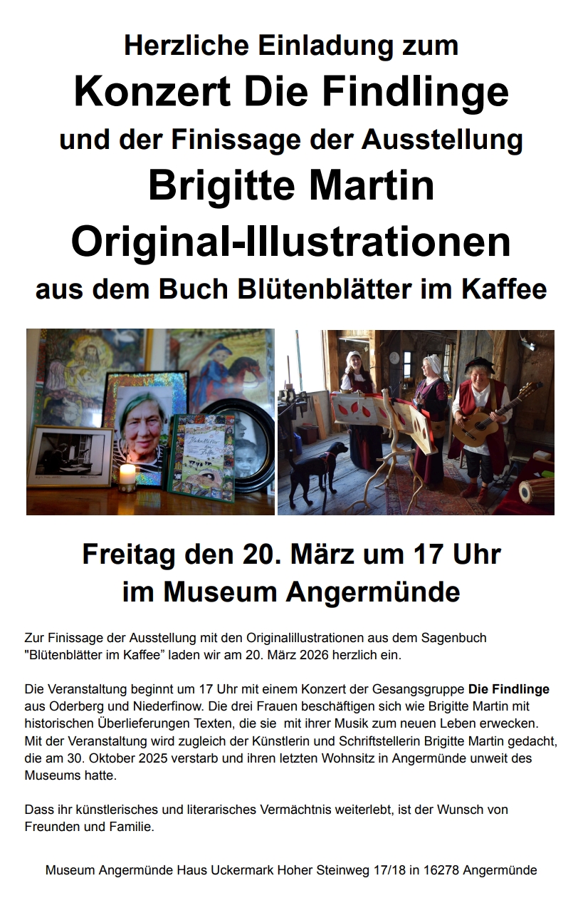 In Erinnerung an Brigitte Martin und ihre Aktivitäten in der Uckermark begehen wir am 20. März 2026 die Finissage ihrer Ausstellung im Museum Angermünde. Beginn 17 Uhr