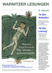 Marion Poschmann schrieb mit ihrem Buch „Die Winterschwimmerin“ eine begeisternde Verslegende über das Glück des Eisbadens. Auch in der Uckermark lieben inzwischen nicht Wenige den Gang ins kalte Wasser, deshalb verbinden wir die Lesung mit einem realen Winterschwimmerlebnis. Ortsvorsteher Daniel Ruff lädt am Nachmittag um 14 Uhr zum gemeinsamen Anbaden ein (Öffentliche Badestelle der Gemeinde Warnitz, Poststraße/ Uckerpromenade), zum Aufwärmen gibt es Gegrilltes und Glühwein.Am Abend um 19 Uhr dann liest – als wärmender Höhepunkt des Badesaisonstarts 2026 – Marion Poschmann aus ihrem Buch. Im Saal der Deutschen Eiche wird für alle der Wirt Holger Rudolf den Bullerofen ordentlich angeheizt sowie Glühwein, warmes Essen und genügend weitere heiße plus kalte Getränke im Angebot haben.