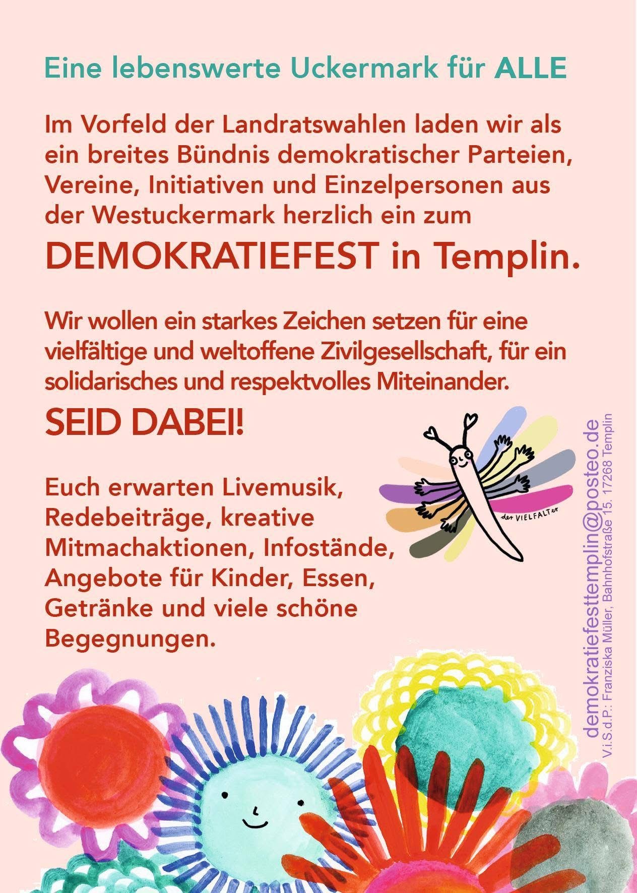 Demokratiefest in Templin am Samstag, den 11. April 2026, 14 bis 17 Uhr