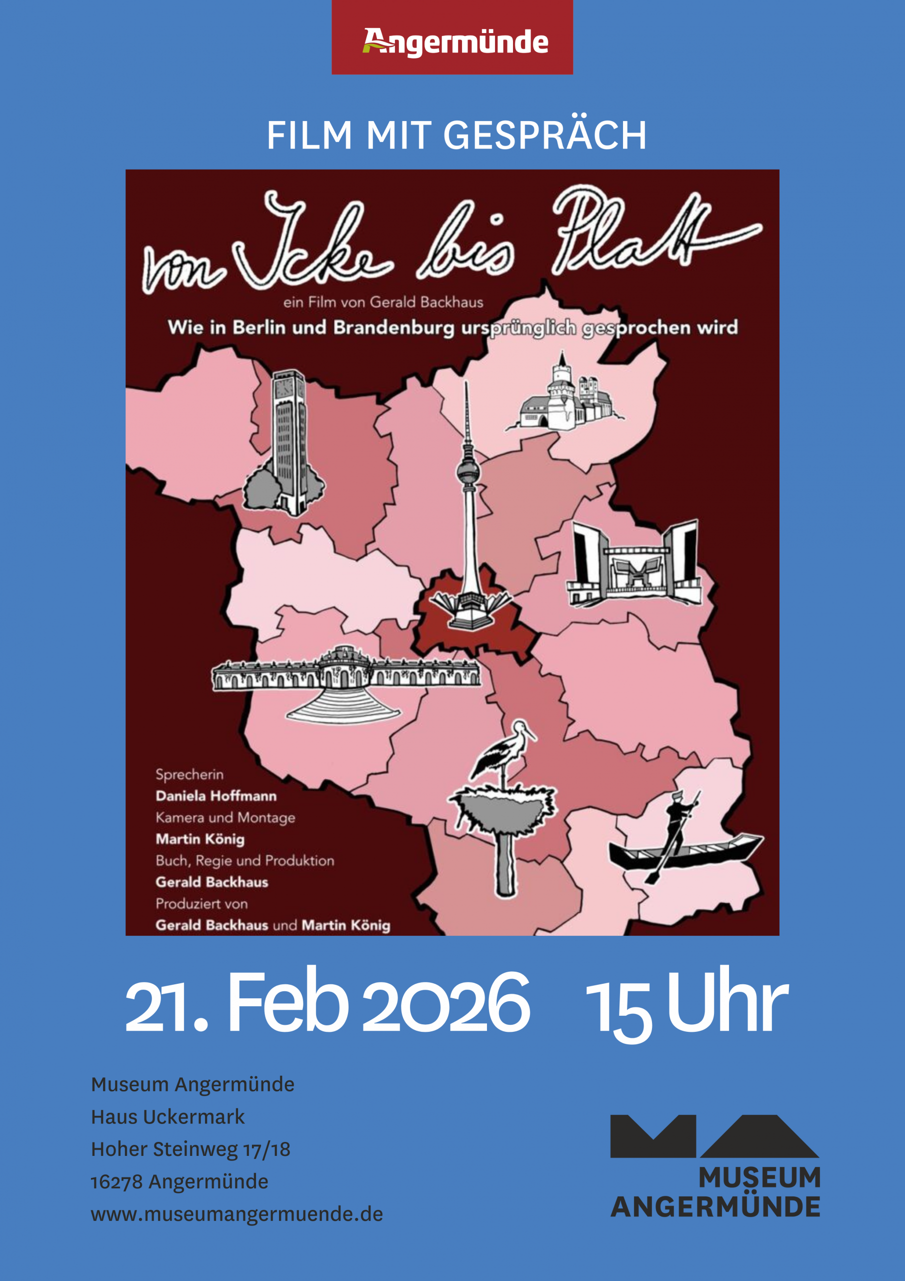 Im Anschluss an die Vorführung steht Regisseur Gerald Backhaus für ein Publikumsgespräch zur Verfügung und gibt Einblicke in die Entstehung des Films. Die Moderation des Gesprächs übernimmt die in Angermünde lebende Künstlerin Kena Hüsers, die u.a. Texte und Theaterstücke im norddeutschen Platt veröffentlicht hat.