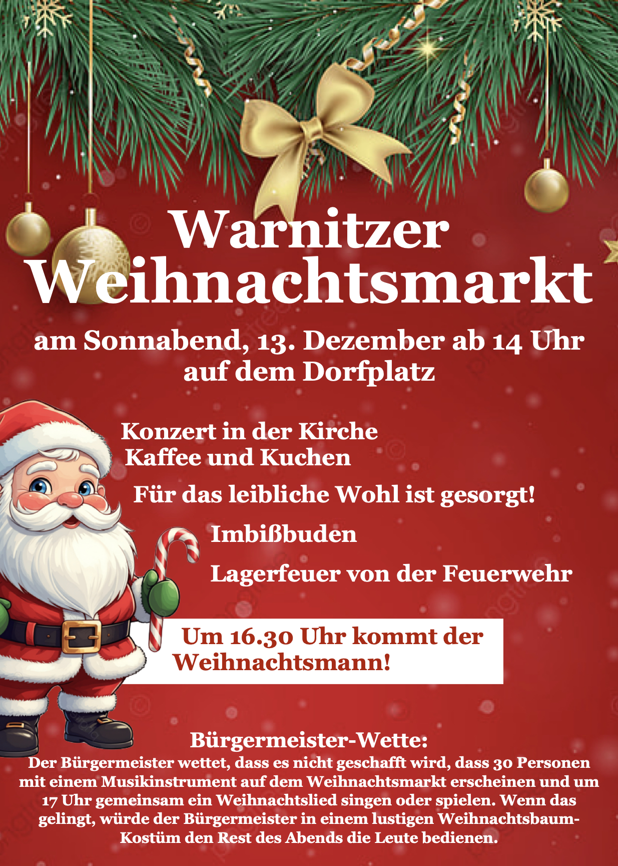 Der Bürgermeister wettet, dass es nicht geschafft wird, dass 30 Personen mit einem Musikinstrument auf dem Weihnachtsmarkt erscheinen und um 17 Uhr gemeinsam ein Weihnachtslied singen oder spielen. Wenn das gelingt, würde der Bürgermeister in einem lustigen Weihnachtsbaum-Kostüm den Rest des Abends die Leute bedienen.
