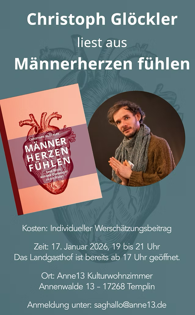 Anne13 Annenwalde 13, TemplinWas, wenn das männliche Herz im Grunde sehr sensibel, aber auch zutiefst verletzt ist? Was, wenn unter den Verletzungen eine ungeahnte Kraft und Lebendigkeit verborgen liegt? Christoph Glöckler nimmt uns mit auf eine Reise – eine Reise in den männlichen Brustraum. Denn dort liegt ein wahrer Schatz verborgen, ein Schatz, der fast schon vergessen geglaubt […]